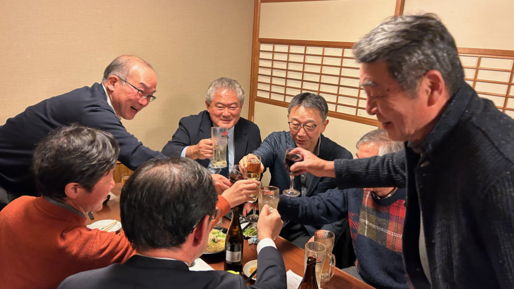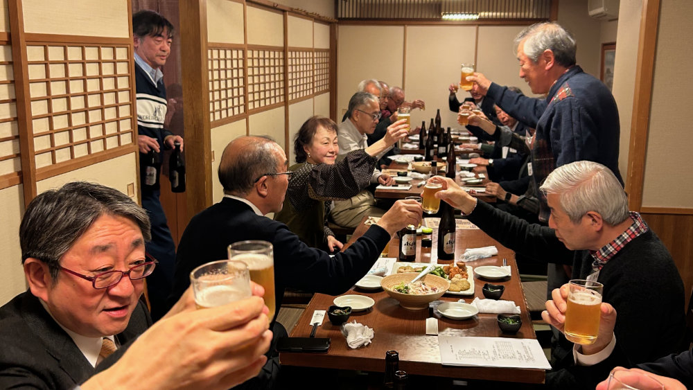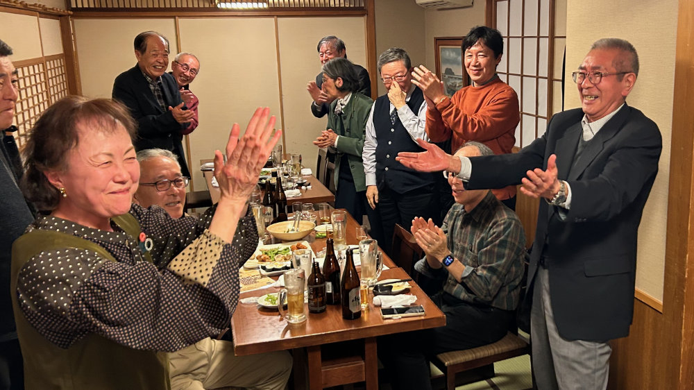 - 新たに年次幹事に加わった細川さん(S57卒)の紹介や、当日最終日を迎えた白堊芸術祭の実行委員紀さん(S56卒)から芸術祭の報告などもあり、中締めは参加者で最高齢の八重嶋さん(S37卒)に音頭を取っていただきました。